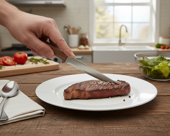 TAXCO - Set de 4 cuchillos de acero inoxidable para carne, con mango de madera de acacia. Presentación: caja individual.