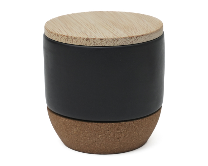 MATERIAL: Cera / Cerámica / Bambú / Corcho MEDIDAS: Ø 7.4 x 7.5 cm MED. EMPAQUE: 34.5 x 26 x 21 cm PESO EMPAQUE: 7.5 kg PIEZAS EMPAQUE: 24