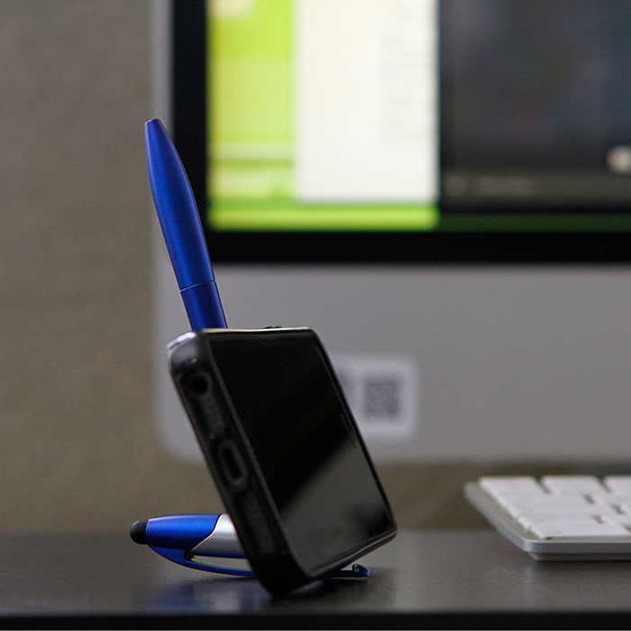 Bolígrafo de plástico Kazán. - Bolígrafo de plástico con puntero touch y diseño superior que funciona como base para celular, tinta de escritura negra.
