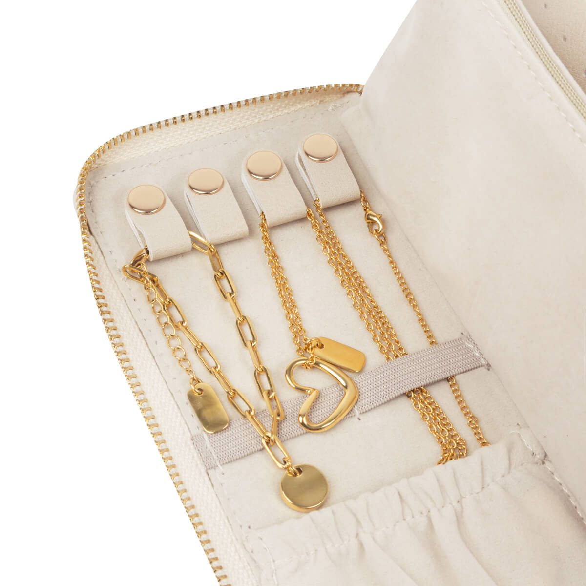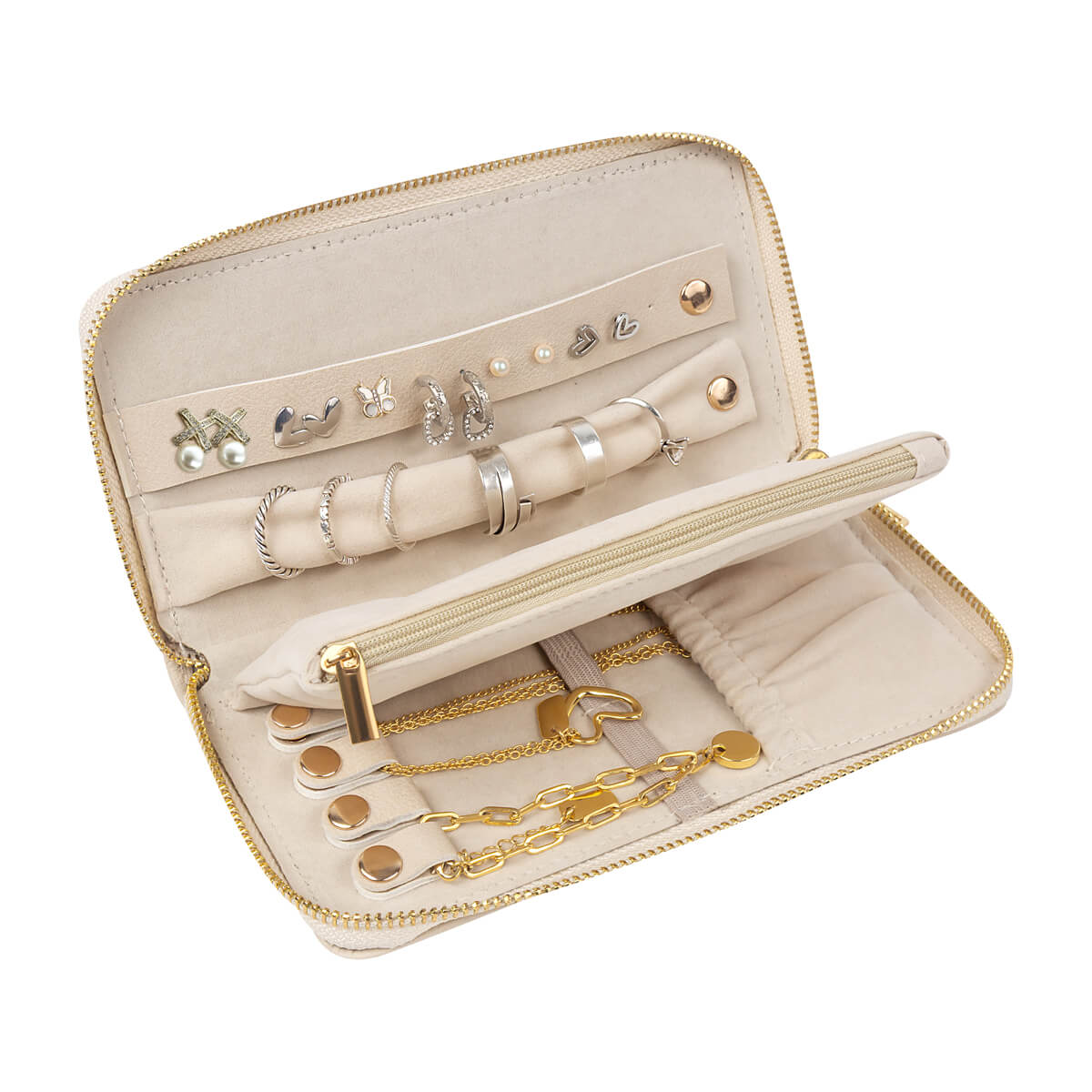 ALHAJERO DE VIAJE NIVA - Organizador de joyería para viaje con diseño tipo cartera. Cuenta con múltiples compartimentos internos para organizar anillos, aretes, collares y pulseras, incluyendo ganchos metálicos, bolsillo con cierre y bandas con broches. Cierre completo y formato compacto para llevarlo en bolsa o maleta sin ocupar mucho espacio.