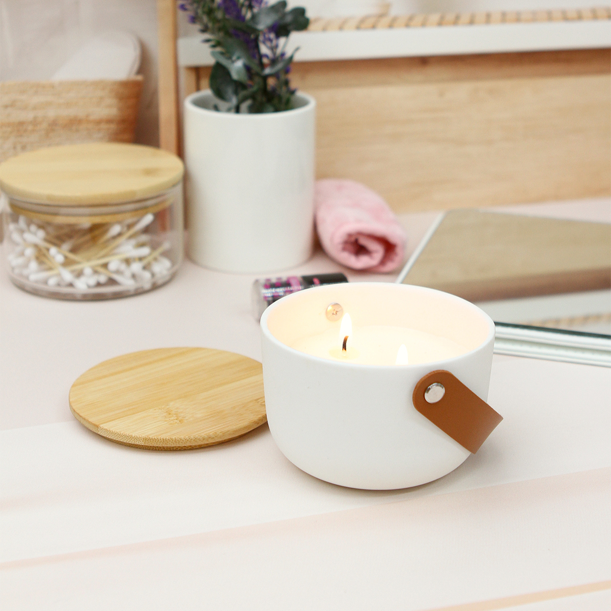 Vela Ladon. - Vela fabricada con cera de soja con esencia de limón y con contenedor de cerámica, su tapa de bambú le agrega un delicado detalle en madera que contrasta con el color blanco de la cerámica. Incluye una agarradera fabricada de curpiel. Su diseño sofisticado hace que sea ideal tanto para el uso en hogares como en ambientes profesionales como, oficinas o boutiques. Incluye caja de cartón individual.
