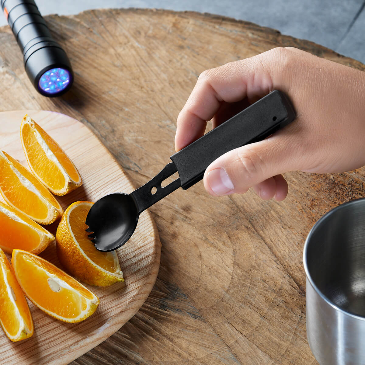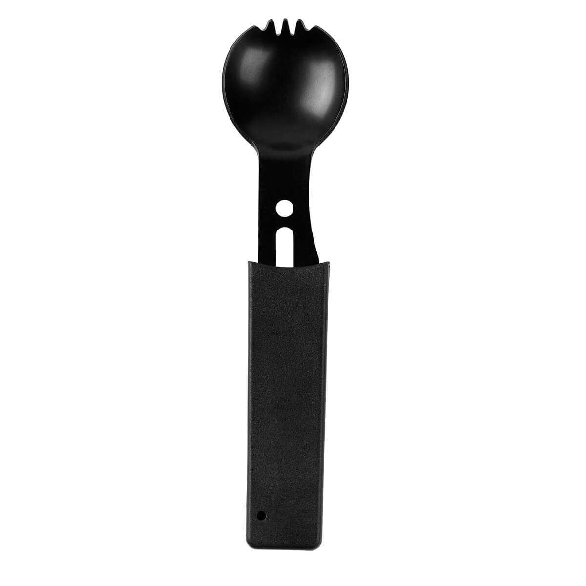 CUBIERTO MULTIUSOS ESKU - Cubierto metálico multifuncional que integra tenedor, cuchillo, destapador, desescamador, orificio para cuerda y silbato de emergencia. Ligero, práctico y listo para acompañarte en cada aventura.
