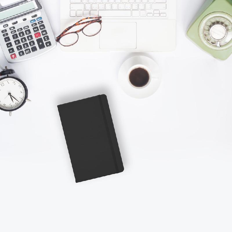 Libreta de pasta dura, con 80 hojas de raya y cinta elástica para cerrar. Medidas: 21 x 13 cm Empaque: Bolsa de celofán.