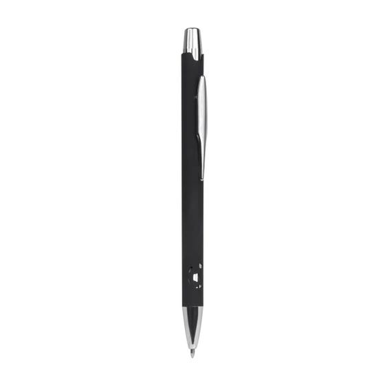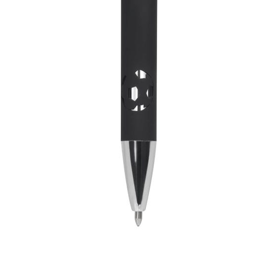 BOLÍGRAFO METÁLICO SOCCER - Bolígrafo metálico, con acabado mate y detalles cromados, con un diseño de balón suajado en el cuerpo. Mecanismo pulsador. Incluye funda con diseño soccer.
