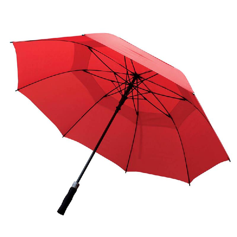 Paraguas con doble faldón. Medidas: 95 x 124 cm Material: Poliester y acero. Empaque: Bolsa de celofán.