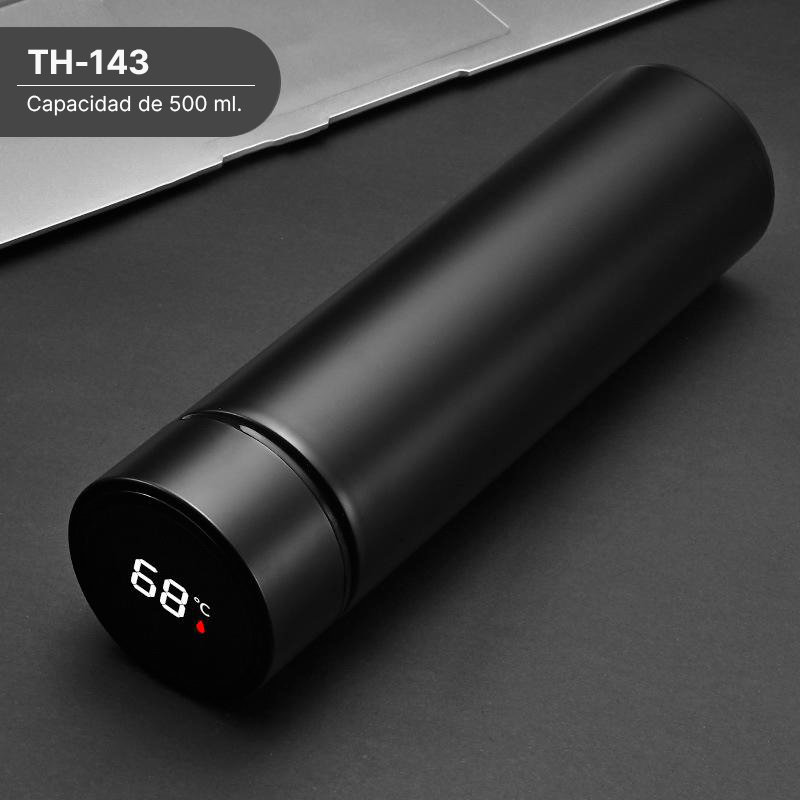 Termo con termómetro. - Termo inteligente de acero inoxidable doble pared; con pantalla LED indicadora de temperatura interior en la tapa. Fabricado en materiales de grado alimenticio, mantiene bebidas frías o calientes por un largo tiempo. La batería dura hasta 2 años. No usar en microondas. Capacidad de 500 ml. Incluye caja de cartón individual.