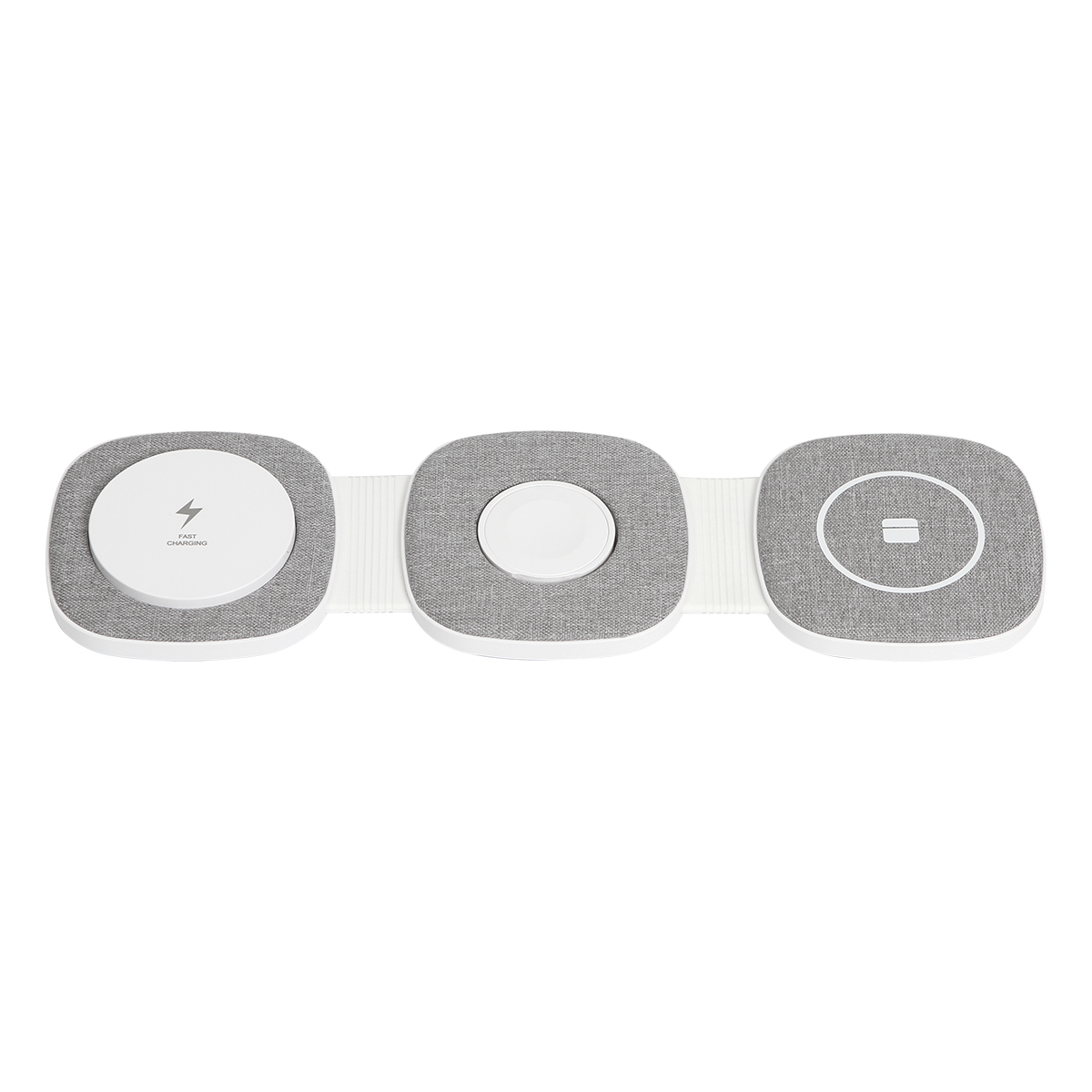Cargador Pratelle. - Cargador inalámbrico plegable 3 en 1, con diseño plegable que le permite llevarlo a todos lados. Necesita conectarse a corriente eléctrica para funcionar.