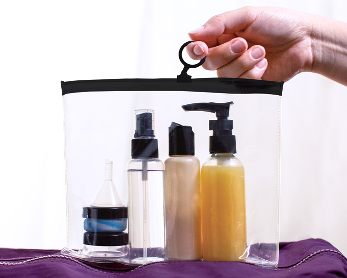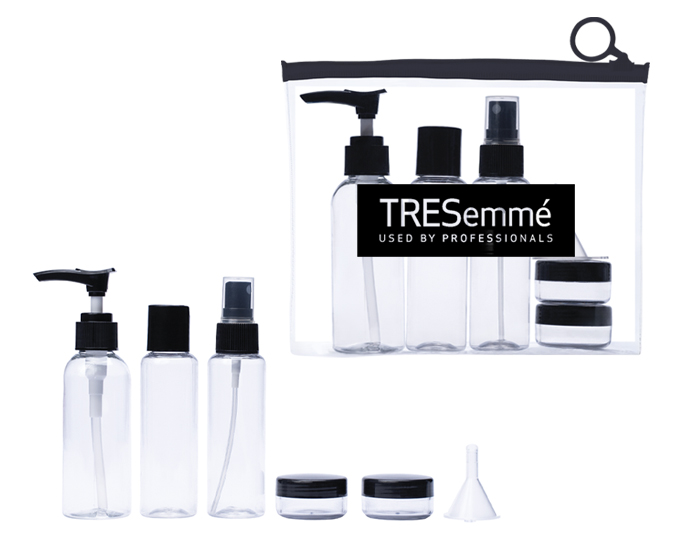 QIRA - Set de contenedores para viaje incluye un contenedor despachador (80 ml), Contenedor con atomizador (60 ml), Contenedor (60 ml), Dos contenedores para crema (10 ml) y un embudo. Estuche transparente con cierre.