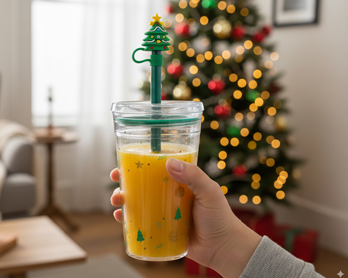 HOLLY - Vaso coleccionable de plástico transparente con motivos de Navidad, cuenta con tapa a presión anti derrames, sellos de silicón y popote verde con protector de popote en forma de Árbol Navideño. Es ideal para bebidas frías. CAP. 450ml. Presentación: Caja kraft.