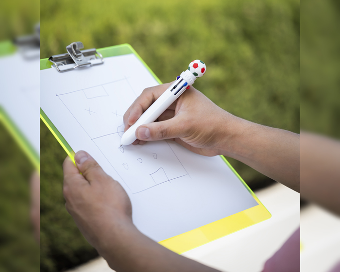 MULTI GOL - Bolígrafo de plástico multitintas con figura de balón tricolor de soccer en la parte superior, incluye 8 colores de tinta diferentes.
