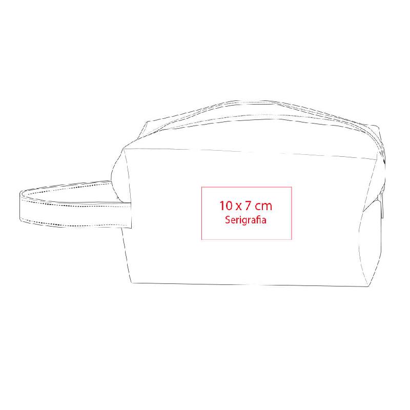 Cosmetiquera rectangular con asa para fácil manejo. Medidas: 18cm x 10.5cm x 9cm / correa 10cm Material: Poliéster. Empaque: Bolsa de celofán.