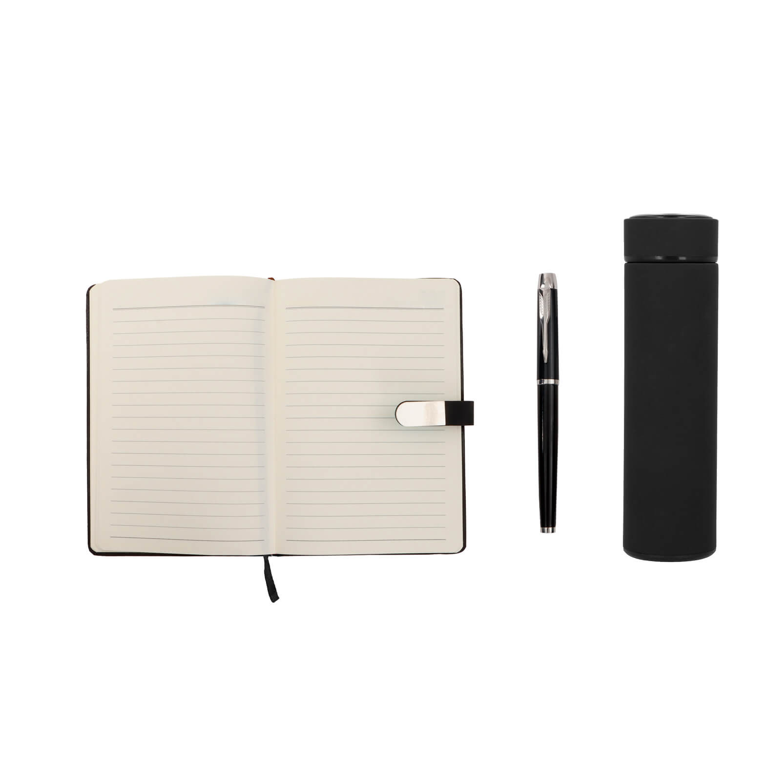 LITT Set ejecutivo que incluye: libreta de curpiel con broche magnético, bolígrafo y termo con acabado rubber con capacidad de 500ml.