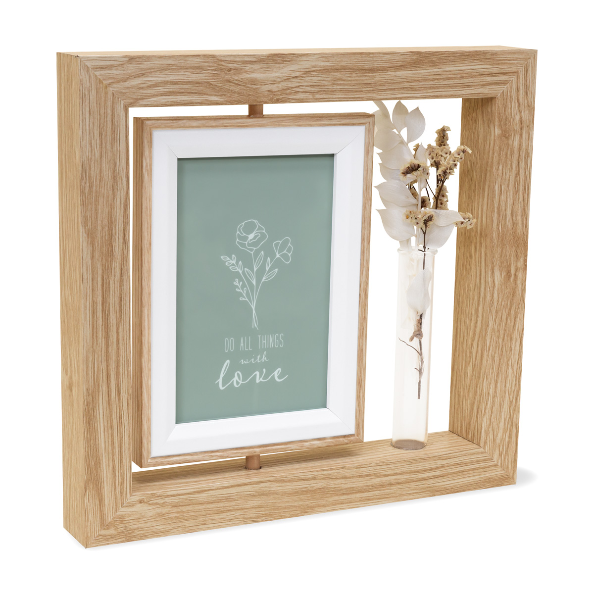 PORTARRETRATO ROSMARY - Su diseño elegante y atemporal, resaltará la belleza de tus fotos favoritas. Contiene un marco giratorio, con capacidad para fotografías de 10 x 15 cm y un recipiente de vidrio con flores secas. Añade un toque cálido y natural a tus espacios. Incluye caja individual.