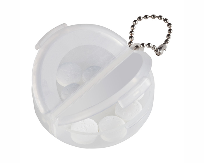 MAINE - Pastillero de plástico traslúcido, con doble tapa y dos divisiones, para control de dosis médica. Incluye cadena para colgar.