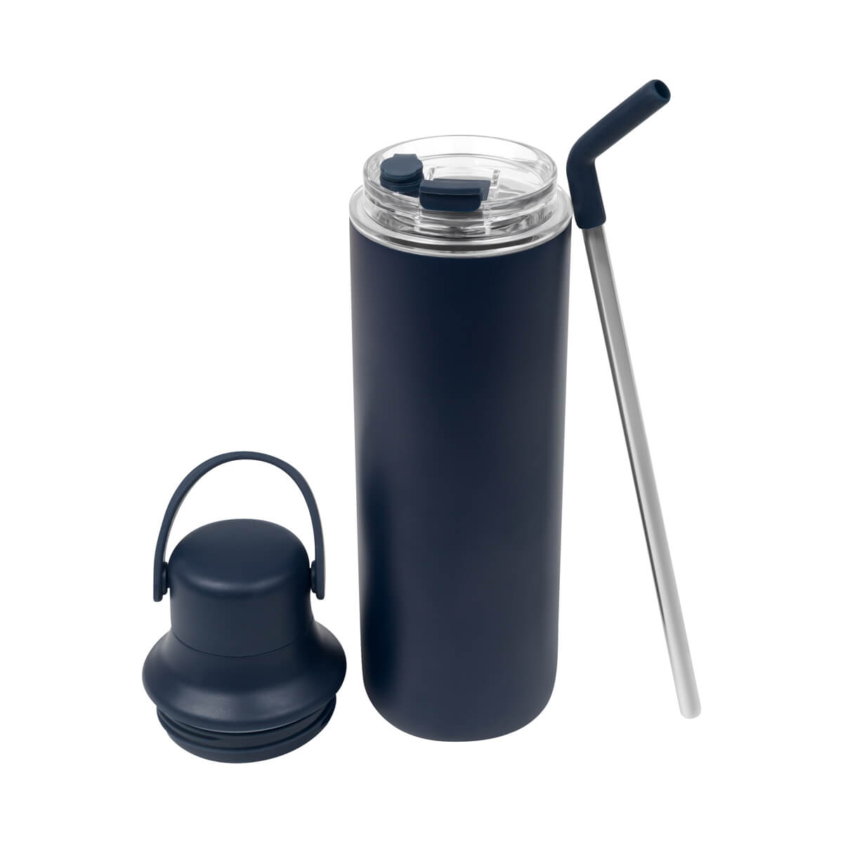 SET DE TERMO DACIO - Original set de termo con tapas intercambiables. Incluye termo doble pared, cerrado al vacío. Pared interna y externa de acero inoxidable. Cuerpo con terminado rugoso que permite tener un mejor agarre. Cuenta con una tapa de plástico con doble sistema de rosca, la más amplia permite introducir hielos y otros ingredientes, mientras que su segunda rosca, incluye una boquilla pequeña, que facilita su uso. Su segunda tapa, también con sistema de rosca, incluye una sobre tapa tipo push y ranura especial para popote. Mantiene temperatura caliente 6 hrs y temperatura fría 12 hrs. Capacidad 20 Oz. Incluye popote metálico con boquilla de rubber y caja de regalo.