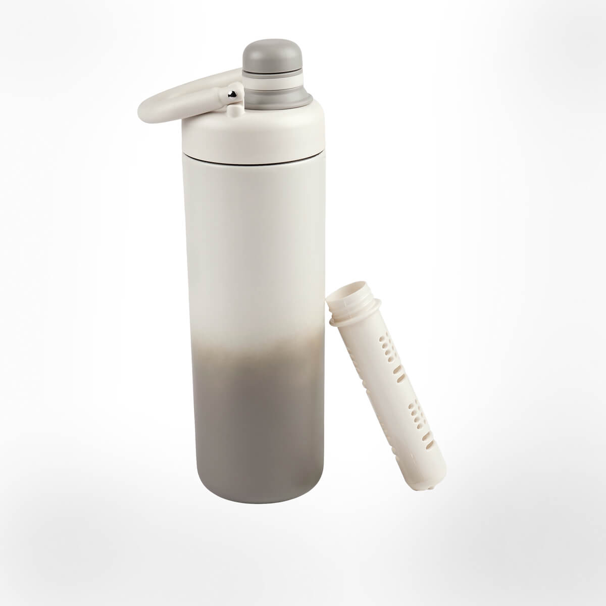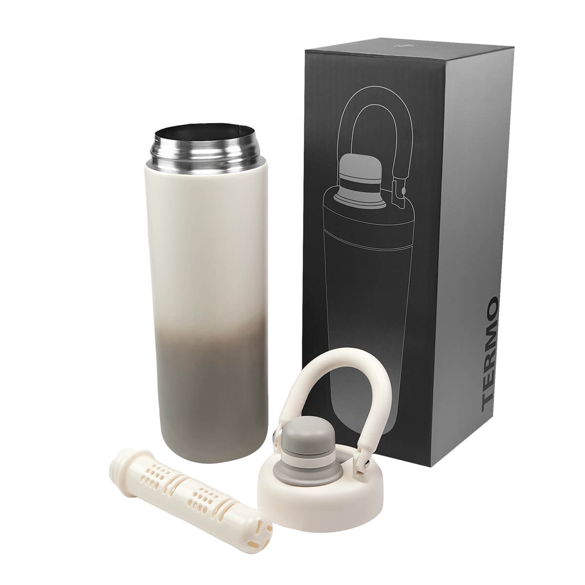 TERMO DAZZ - Termo doble pared. Cerrado al vacío. Pared interna y externa de acero inoxidable. Terminado en texturizado rugoso, que facilita su agarre. Incluye tapa de plástico con sistema de rosca, sobre tapa con boquilla y filtro interno para infusiones o tisanas. Su diseño elegante y minimalista se complementa con un asa ergonómica que facilita el transporte, ideal para transportarlo a donde quiera que vayas. El termo está pintado a mano, por lo tanto el color y degradado pueden variar en todos los modelos. Mantiene tus bebidas calientes por 6 hrs y frías hasta 12 hrs. Capacidad de 27 Oz. Incluye caja individual.