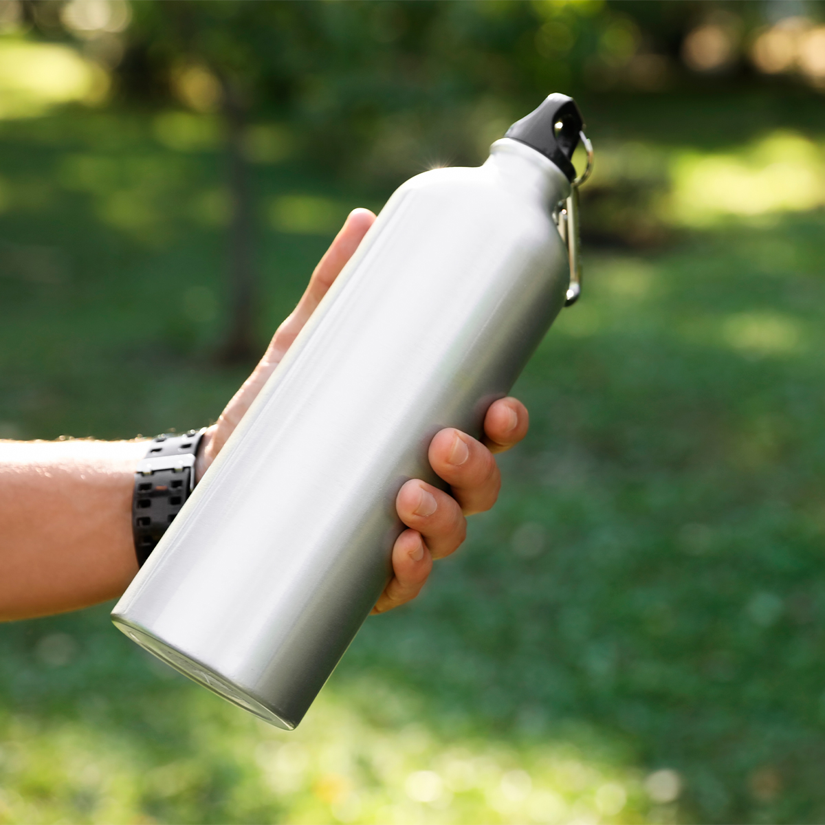 Termo metálico. - Termo fabricado en acero inoxidable y tapa de rosca anti derrames con arnés, fabricado en materiales de grado alimenticio, mantiene bebidas frías o calientes por un largo tiempo, no usar en microondas. Capacidad de 750 ml (25 oz). Incluye caja de cartón individual.