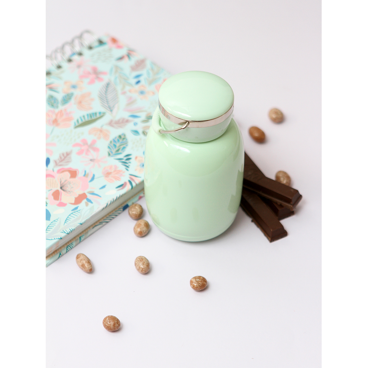 Termo Solano. - Termo de acero inoxidable doble pared con tapa de plástico, asa metálica y detalle de color en asa. Fabricado en materiales de grado alimenticio, mantiene bebidas frías o calientes por un largo tiempo. No usar en microondas.  Capacidad 230 ml. Incluye caja de cartón individual.