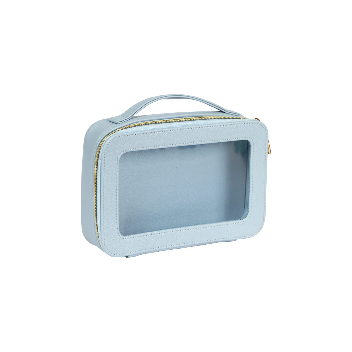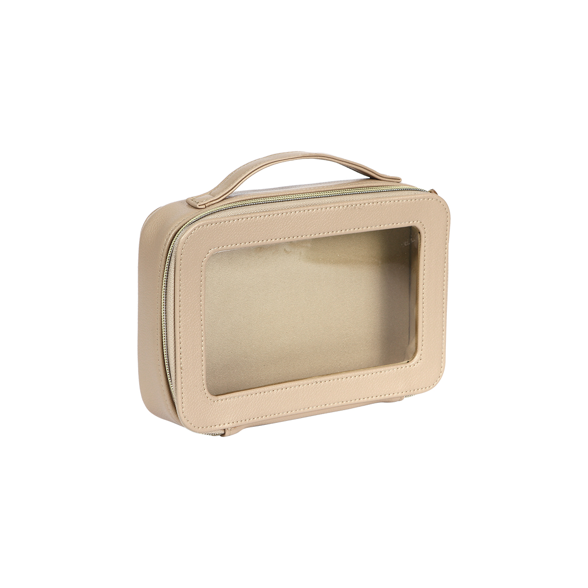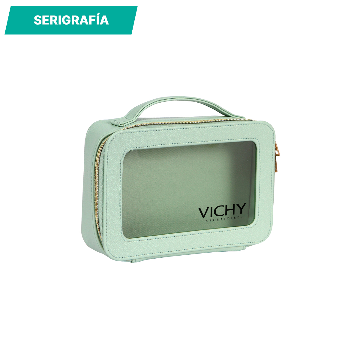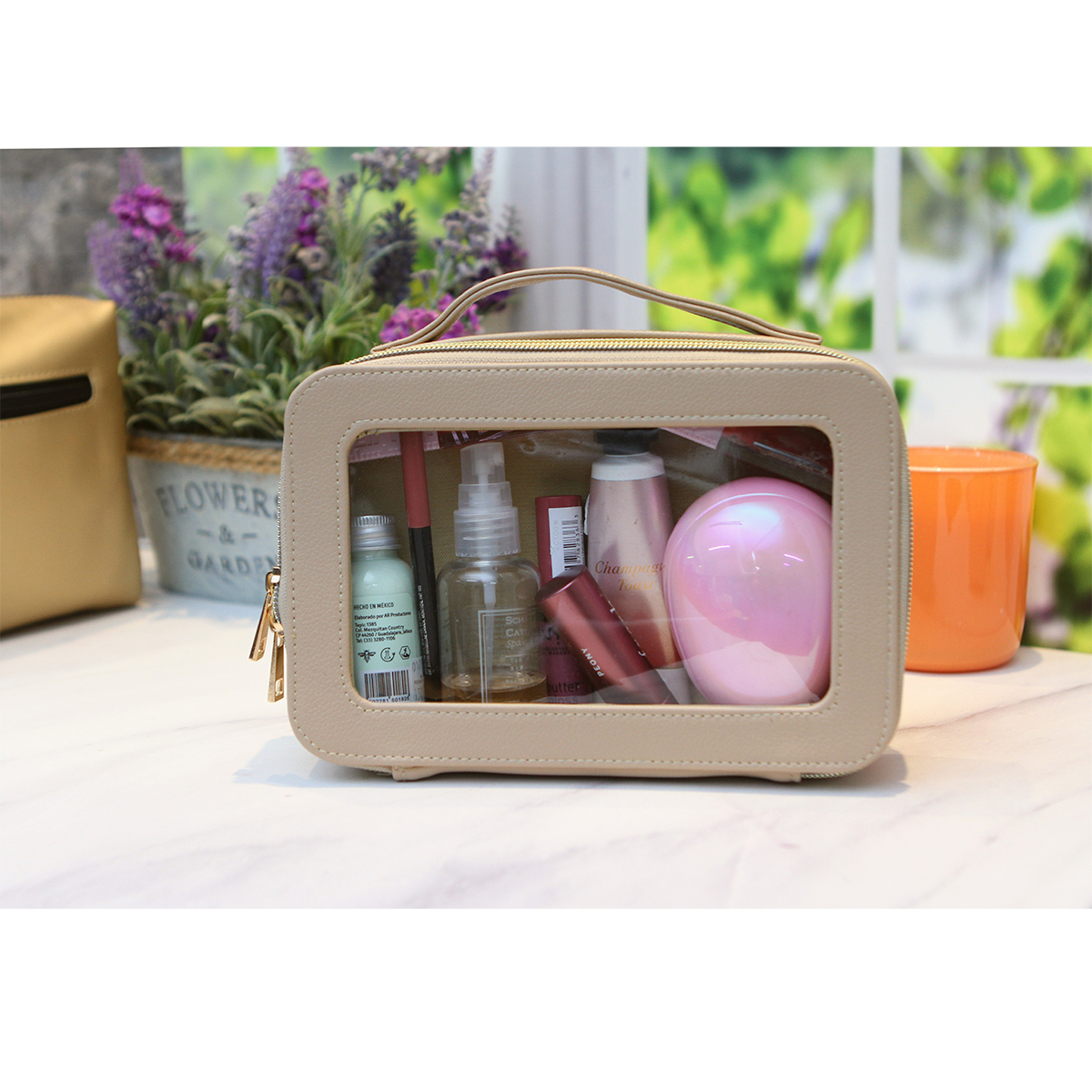 Cosmetiquera Gastein. - Cosmetiquera fabricada en curpiel con ventana traslúcida fabricada en plástico tipo PVC. Compartimento principal con cierre metálico. Cuenta con un asa en la parte superior para una mejor manipulación y traslado.